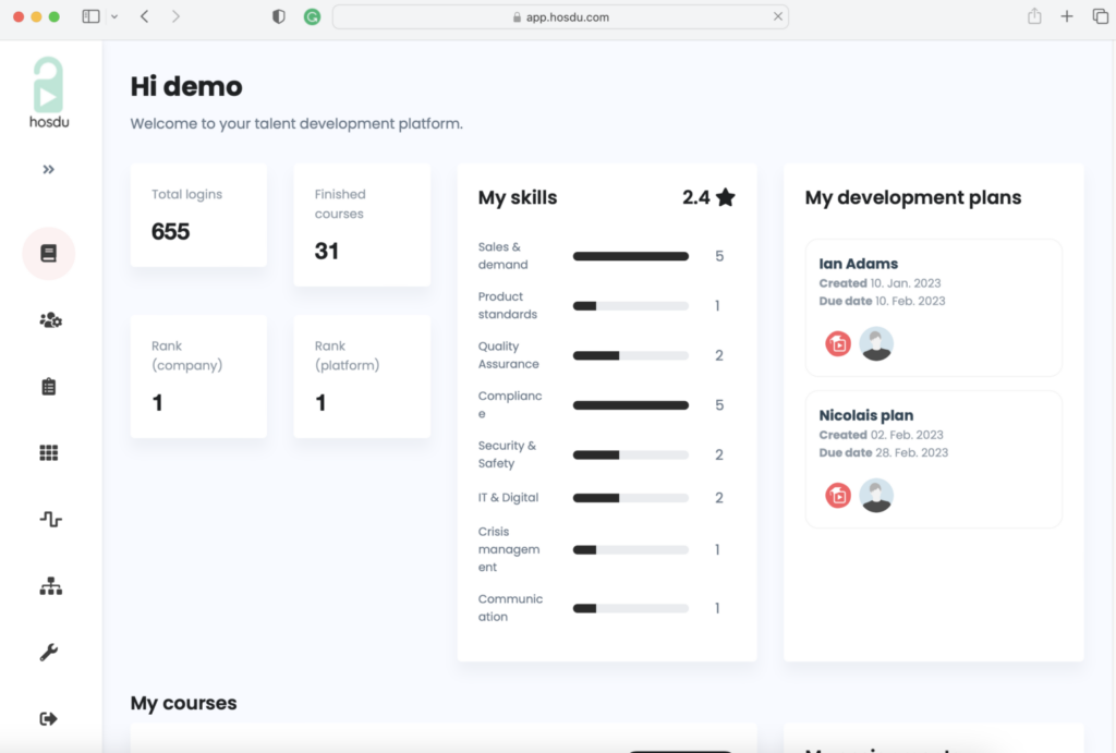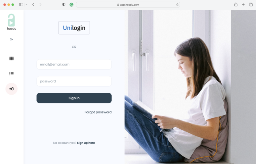 Nice to knowYou can log in to hosdu.com from your web browser (computer, tablet, or phone) AND from the app on your phone. Your app works like an interface to the web platform with fewer details but is more user-friendly. If you need detailed reports then we recommend using the web platform instead. If you wish to use the web platform, simply click on the "login" button top of this page.